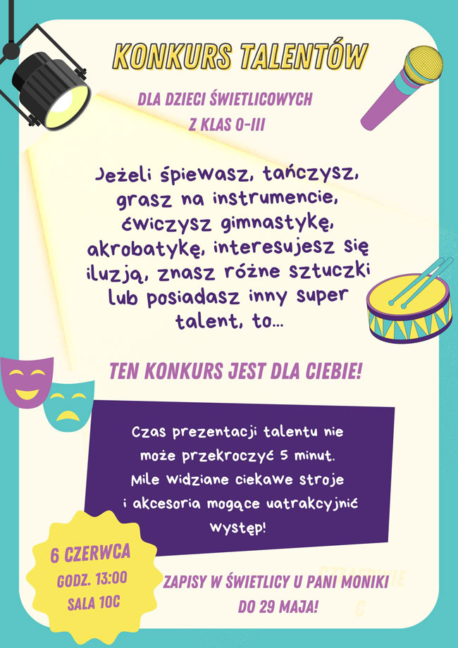 Serdecznie zapraszamy dzieci z klas 0-III uczęszczające do świetlicy szkolnej do udziału w Konkursie Talentów. Szczegóły na plakacie😃
