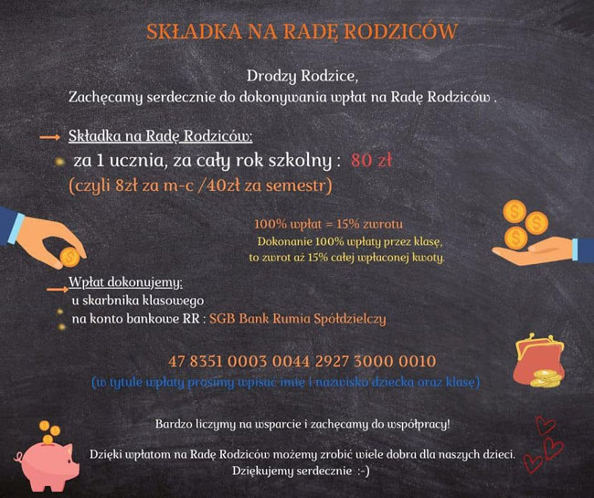 Rada Rodziców uprzejmie prosi o wpłaty składki. 80zł za cały rok szkolny to tylko 8zł miesięcznie!