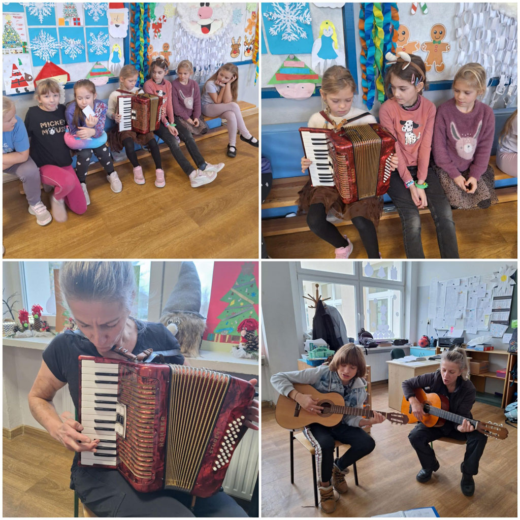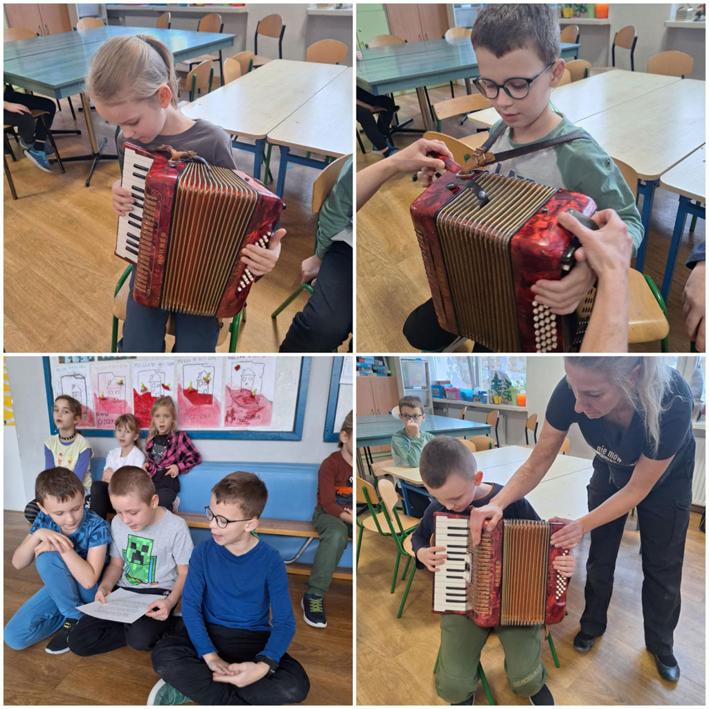 W ramach współpracy z biblioteką szkolną w świetlicy organizowane są zajęcia umuzykalniające dla dzieci. Uczniowie zapoznają się na nich z instrumentami muzycznymi. Poznali między innymi gitarę, harmonijkę, akordeon. Dzieci wspólnie śpiewają i grają, a przy okazji rozwijają pasje muzyczne🎸🎹🎻