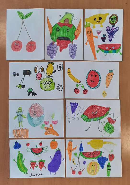 Na koniec wykonaliśmy rysunki ulubionych warzyw i owoców w sposób zachęcający do ich spożycia😀 Prawda, że wyglądają smakowicie?😀
