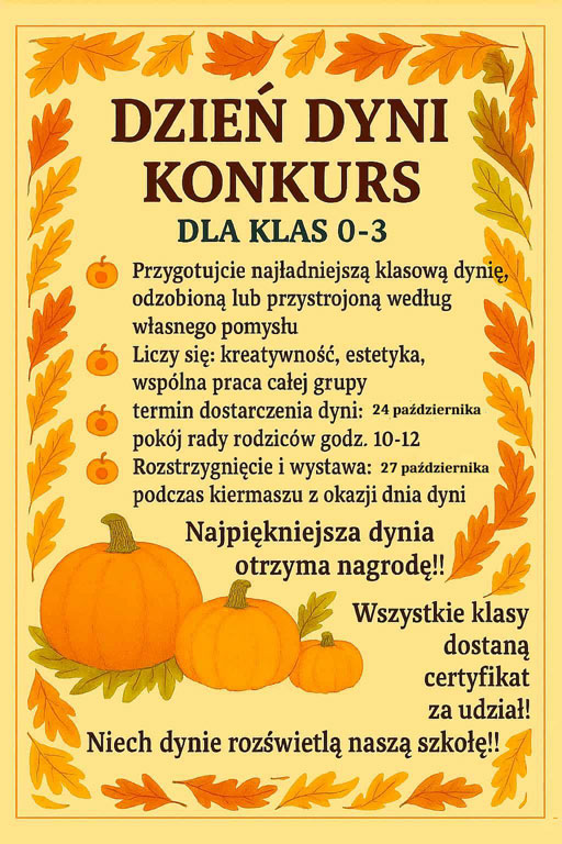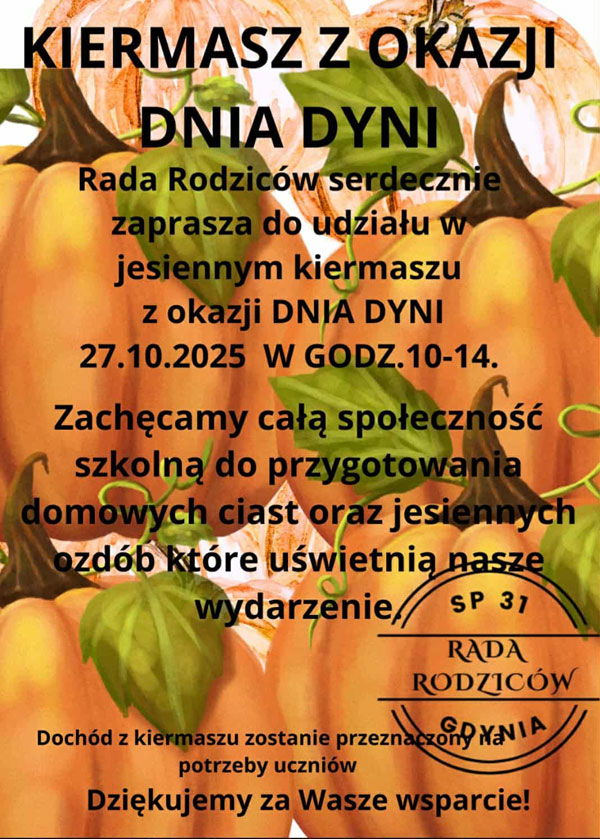 Rada Rodziców serdecznie zaprasza całą społeczność szkolną do udziału w kiermaszu z okazji Święta Dyni.