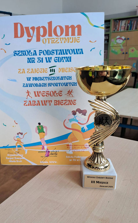 W dniu 14. 04. uczniowie klas 1-3 wzięli udział w międzyszkolnych zawodach sportowych "Wesołe Zabawy Bieżne" organizowane przez Szkołę Podstawową nr 52. Nasi podopieczni zajęli III miejsce, z czego jesteśmy bardzo dumni! Serdecznie gratulujemy!