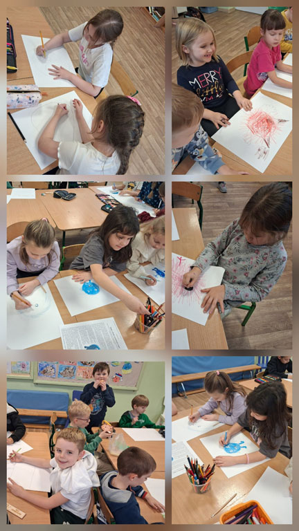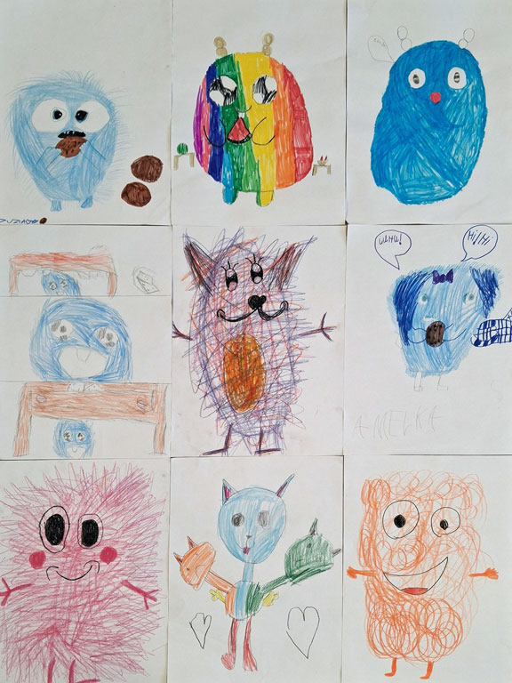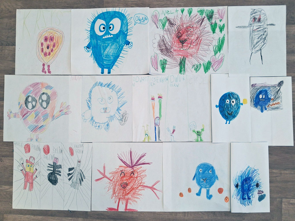 Dużo radości dostarczyło nam wykonanie portretu wymyślonego przez siebie potwora. Nasze potworki, podobnie jak główny bohater bajki, okazały się być bardzo przyjaznymi stworzeniami😀