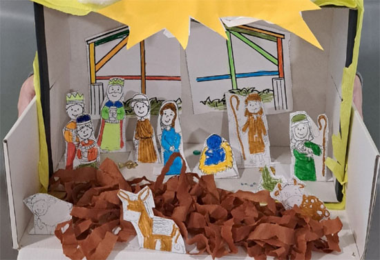 Każde dziecko wykorzystało swoją wyobraźnię i dostępne materiały, tworząc wyjątkowe, kolorowe i pełne detali prace. W środku szopek