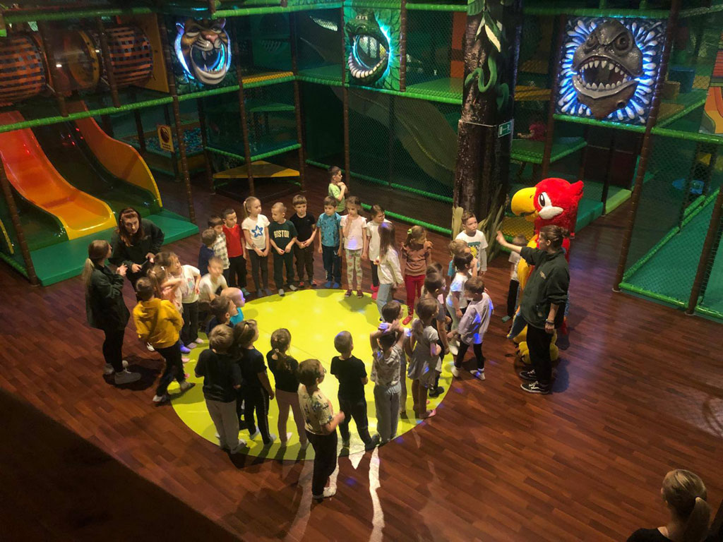 dzieciom w tym kolorowym świecie zabawy. Basen z kuleczkami, huśtawki, zjeżdżalnie, zabawy z przyjaciółmi, zagadki i ciekawostki ze świata dzikich zwierząt, tańce, olbrzymia papuga, liany, tory przeszkód i wspinaczkowe,